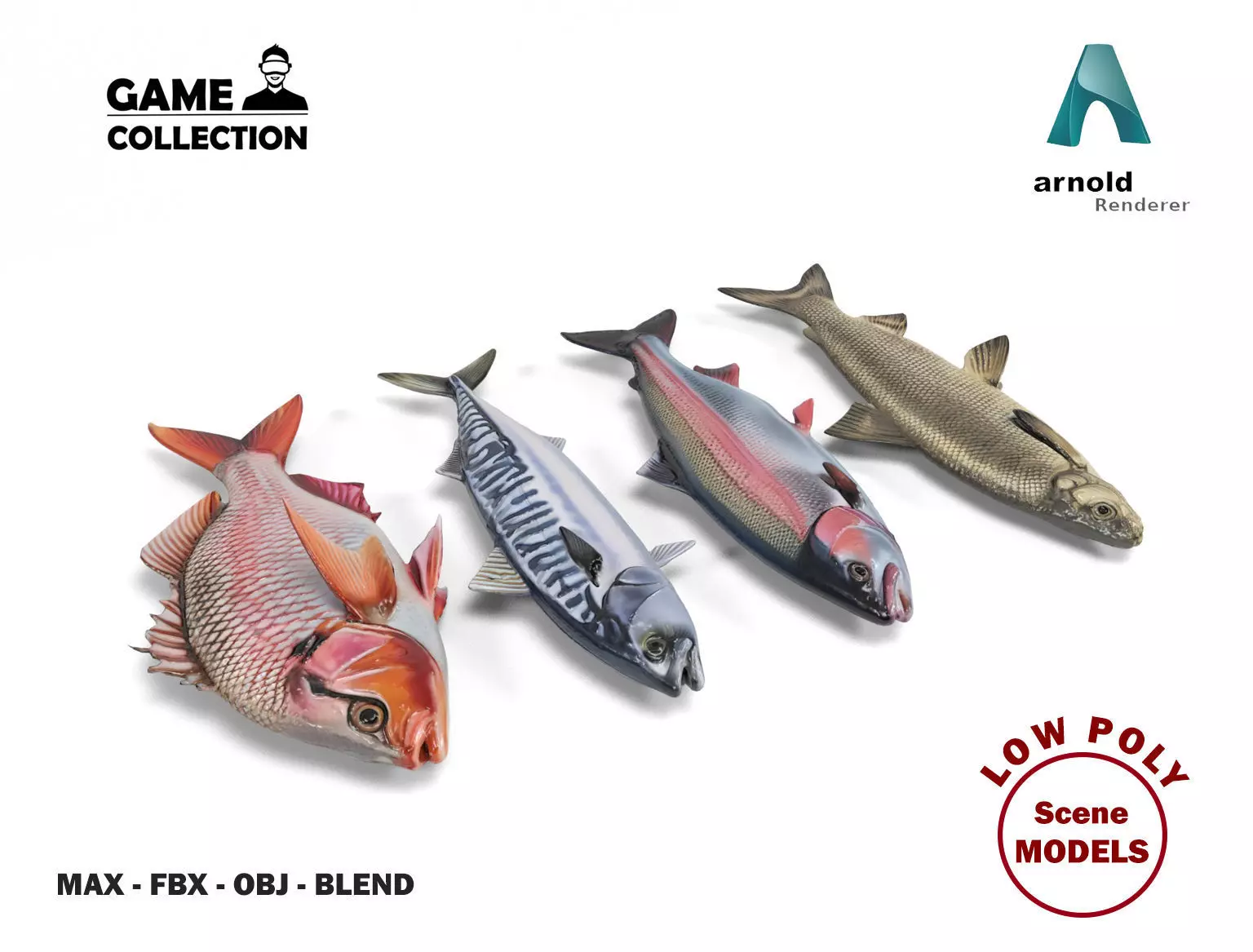 3D Models of Fish (salmon, trout, mackerel). All the models are low poly, basic but realistic and are ideal for 3D scenes that require few polygons. They can be used for advertising visualitations and also for games or applications. It has been created in different 3D Studio Max versions and also in FBX, OBJ, and blend.