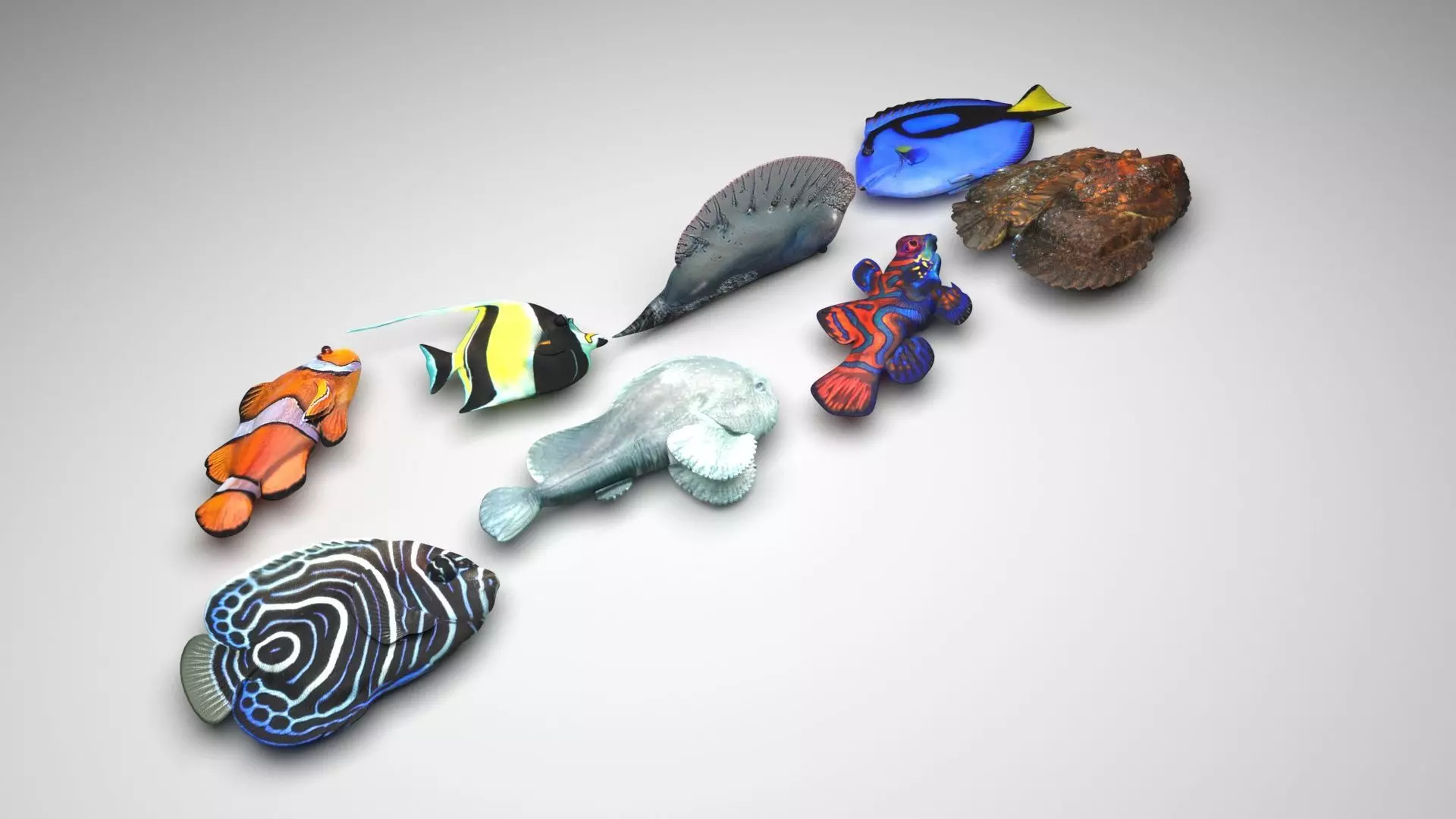 clownfish - 16,080 polygons, 9,654 verticesmoorish idol - 33,430 polygons, 20,422 verticesportuguese man o' war - 9,296 polygons, 4,654 verticesregal tang - 32,344 polygons, 17,586 verticesblob fish - 29,780 polygons, 26,618 verticesjuveline emperor angelfish - 57,020 polygons, 30,998 verticesmandarin fish - 14,496 polygons, 7,254 verticesstone fish - 366,784 polygons, 183,398 vertices