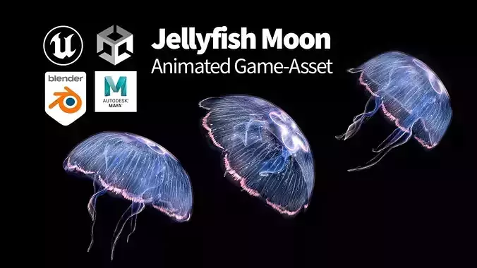 The Moon JellyfishRealistic jellyfish models with translucent textures and fluid tentacle movement. Perfect for enhancing underwater scenes with natural elegance and depth. Suits games, animations, and marine simulations.The Moon Jellyfish was created based on the actual size of a real Moon Jellyfish. Her body width is about 40 cm. This asset has 5 animations, 4 of which are loops.