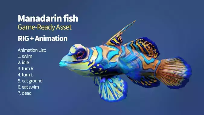 The Mandarin fish game asset. Rig + Animation. The fish model was built in real world size 7 cm.