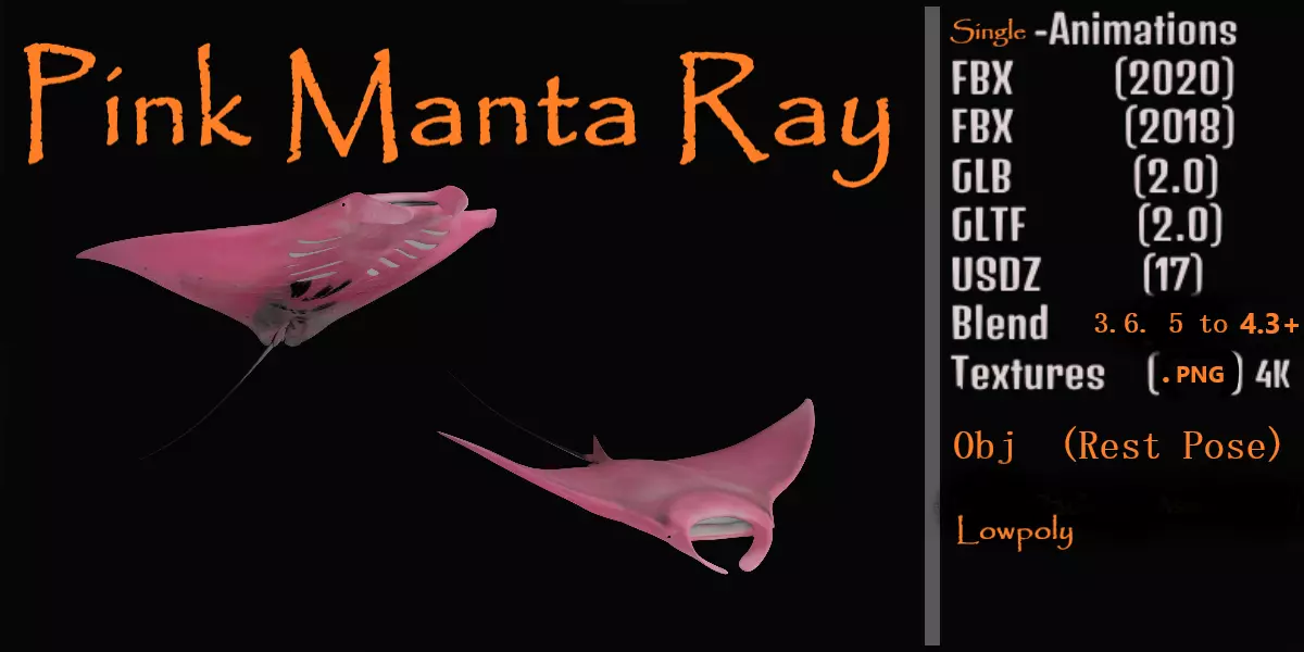 Manta rays are large rays belonging to the genus Mobula. The larger species, M. birostris, reaches 7 m in width, while the smaller, M. alfredi, reaches 5.5 m. Both have triangular pectoral fins, horn-shaped cephalic fins and large, forward-facing mouths..3D Pink Manta Ray Fish Animal Model By Nyilonelycompany (nyc).