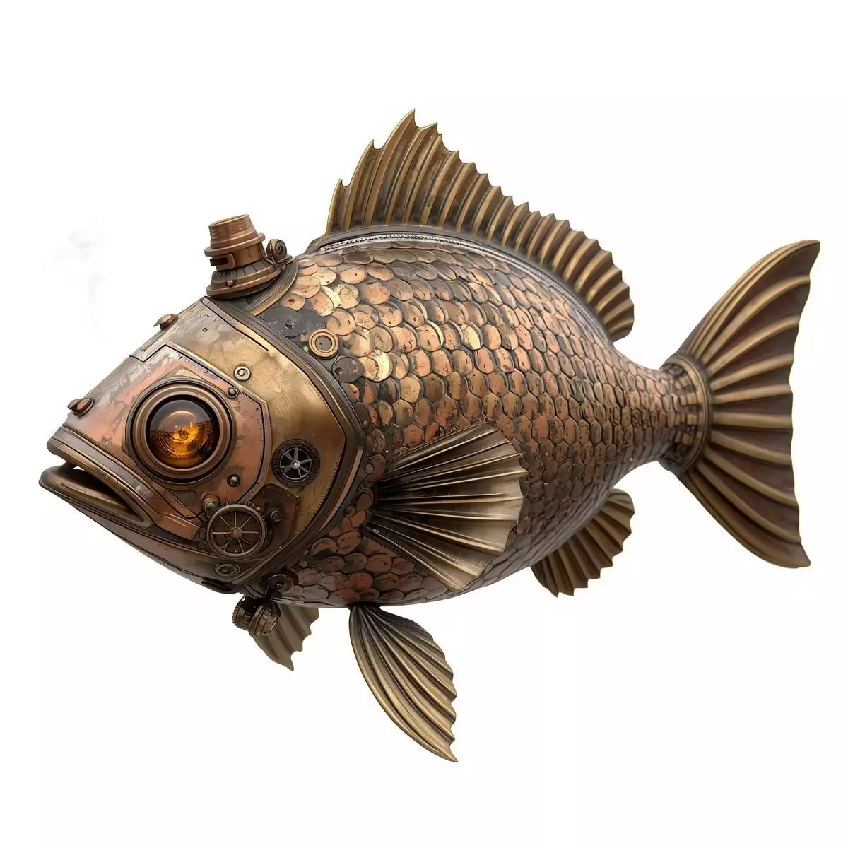 The fish's body is covered in overlapping brass and copper mechanical scales, giving it a textured, armored appearance. The head is a solid, riveted piece of metal plating with a prominent glowing amber glass eye set in a round porthole frame. Small rotating micro-gears are visible along the body and face, and steam vents are located near the fins, suggesting propulsion or environmental management. The fins and tail are made of articulated layered metal segments. The overall color scheme is dominated by aged copper and brass, reinforcing the industrial-era technology aesthetic.