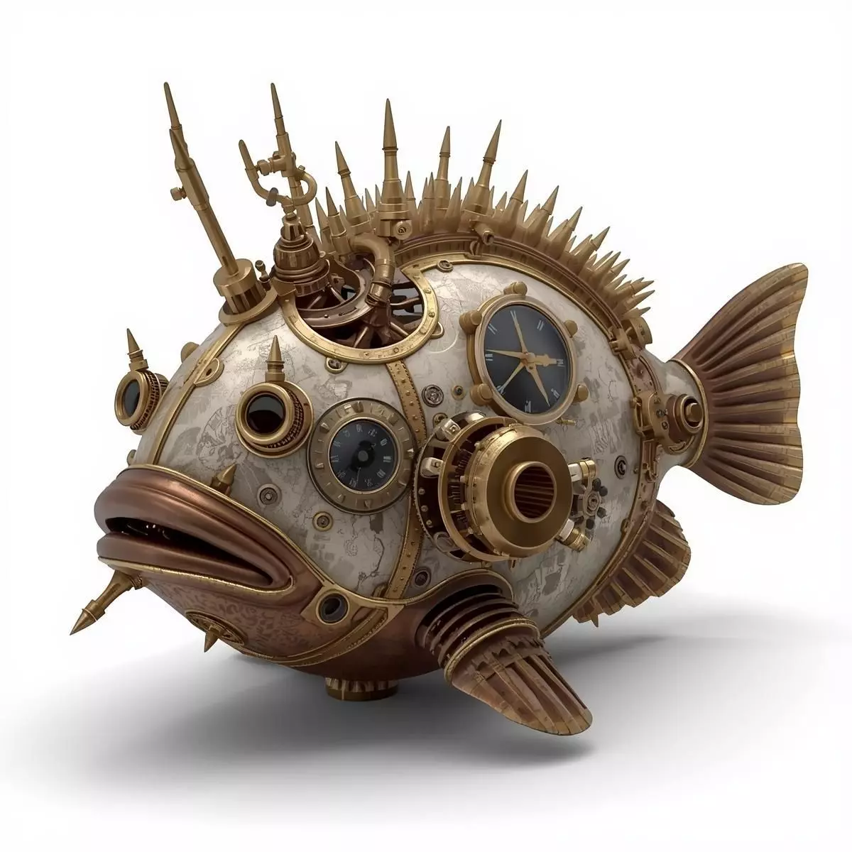 Steampunk Pufferfish Creature 3D ModelDescriptionThis 3D model depicts a highly detailed Steampunk Pufferfish. The design is entirely mechanical and complex, embodying a defensive aquatic automaton with Victorian-era industrial detailing, pressure gauges, and sharp mechanical spikes.