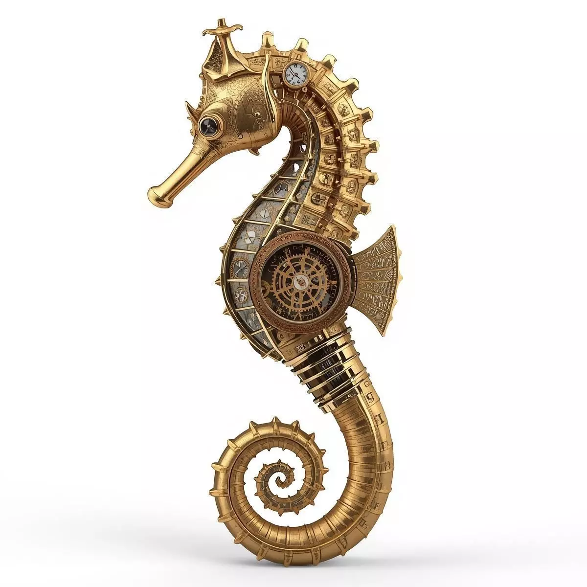 Steampunk Seahorse Creature 3D ModelDescriptionThis 3D model depicts an ornate, highly detailed Steampunk Seahorse. The design is purely mechanical, embodying a rich Victorian industrial aesthetic with complex brass plating, exposed clockwork, and functional gauges, suitable for a striking prop, creature, or robot in an aquatic or fantasy setting.