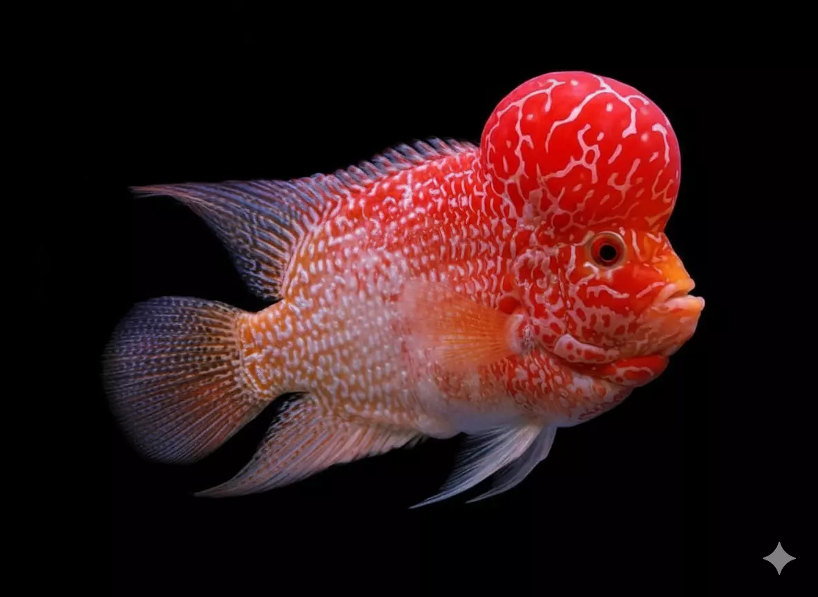 This 3D model captures the striking beauty of a Flowerhorn cichlid, rendered with vivid red and white coloration and intricate scale patterns. The fish’s bulbous head features swirling red markings that contrast sharply with its translucent, flowing fins, while its large, expressive eye adds lifelike detail. The sculpture is posed dynamically mid-swim, emphasizing fluid motion against a stark black background. Key attributes include: