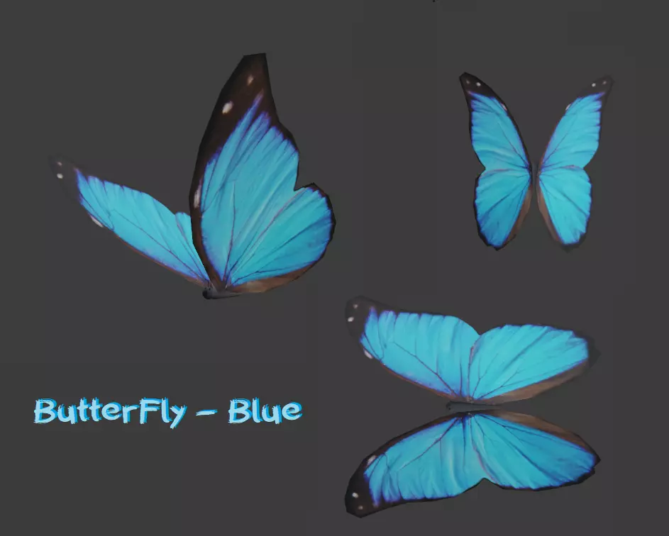 [ESPAÑOL]Mariposa Azul. Caras: 414; Vértices: 444; Tris: 796. Animación de vuelo (Armadura/Animación de vuelo). Modelada en Blender 2.9 y desarrollada para un escenario de juego. La animación se puede usar en la máquina de estados de Unreal Engine. Se han añadido nuevas texturas para Blender, Unity y Unreal Engine (archivos comprimidos). ¡Gracias por su tiempo!