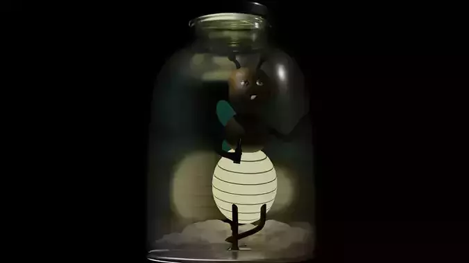This 3D scene contains a drunken firefly that has blue transparent wings, it is brown, also has a light underparts. He has two arms and legs.