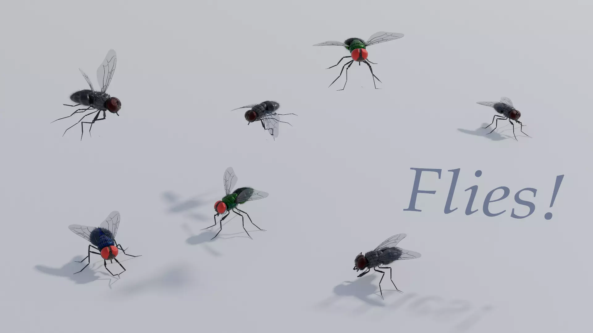 2 new files with the flies rigged in hair and mesh modes and with 6 useful poses included.You must activate the Animation: Pose Library addon in your preferences tu use the poses.