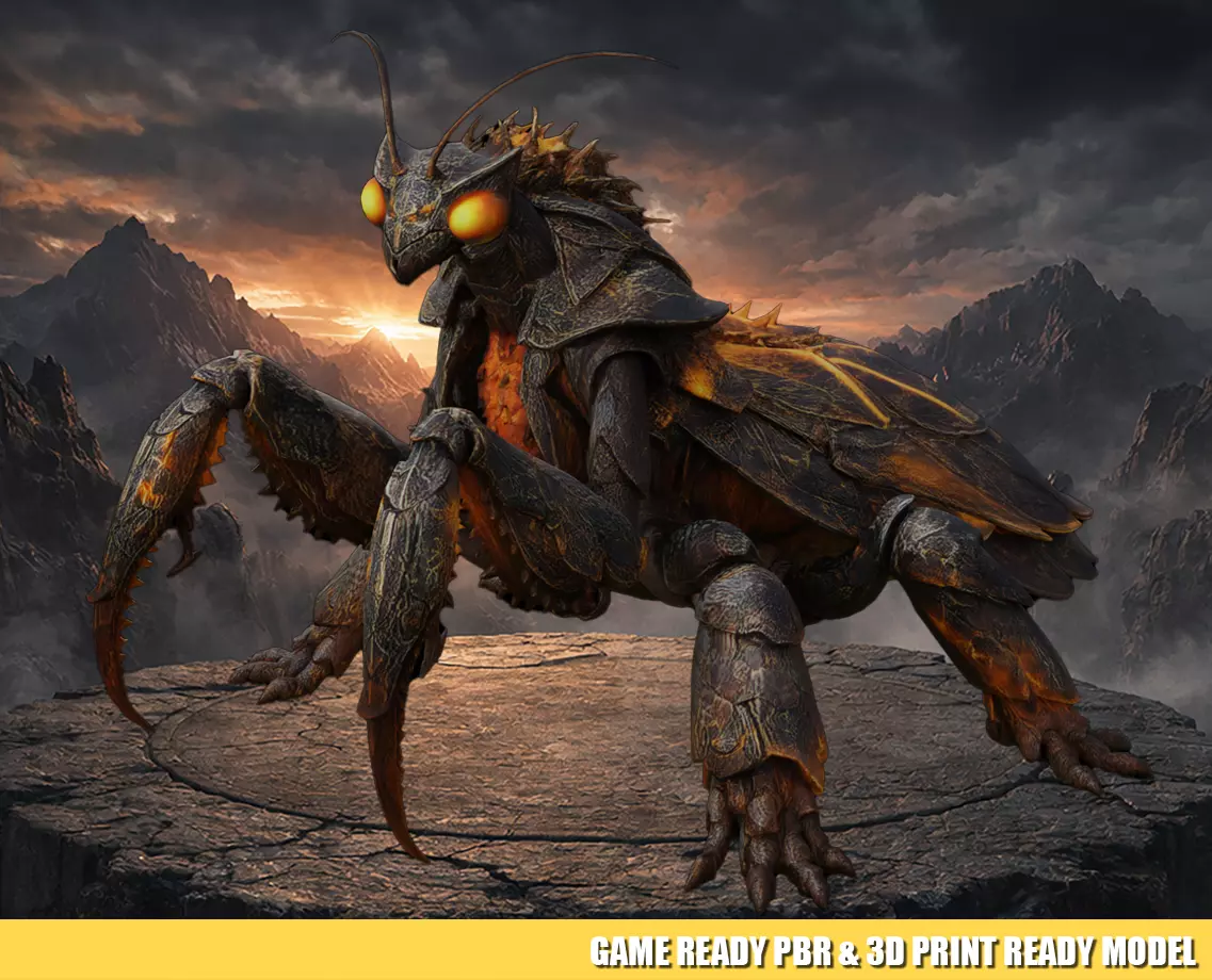 This creature features a heavily armored body, sharp forelimbs, glowing compound eyes, and long antennae, giving it an aggressive and alien insect appearance. The layered exoskeleton plates and organic surface patterns add a natural yet threatening look suitable for fantasy, sci-fi, or monster-based environments.