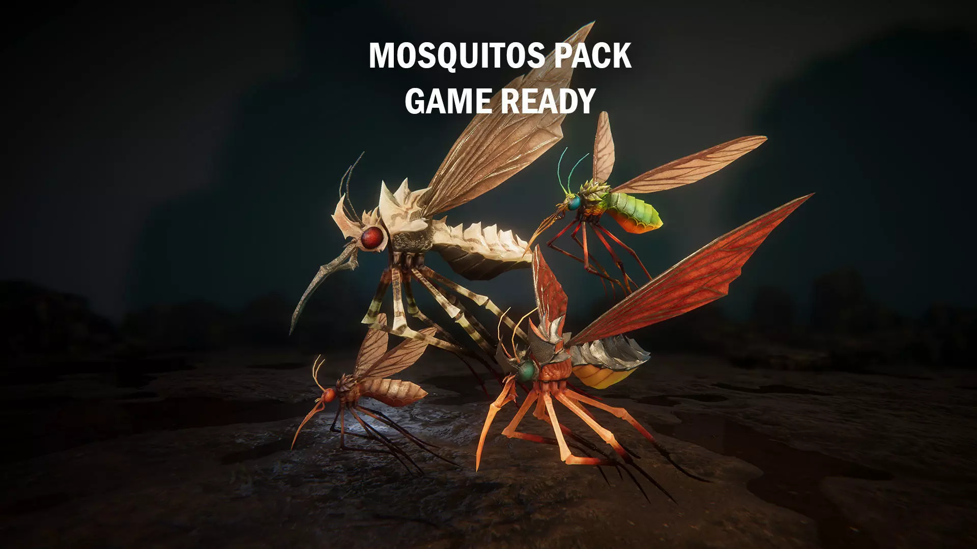 Here are two mosquitos and each one of them have two different textures. Also package include 15 animations.Polygon counts:Mosquito 1 - 2661Mosquito 2 - 2492Animations list:Hit from four sidesTwo deathThree kind of stingsTwo kind of flyFlying end and startRunIdle