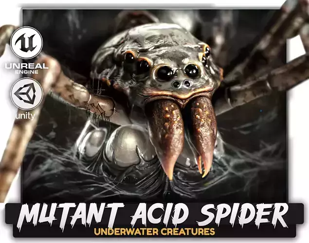 Acid Spider - a realistic, rigged & animated creature from the Underwater Creatures line.This toxic spider is a hybrid insect and beast, a monster evolved in darkness to hunt, melt, and consume. Its alien carapace gleams with wet acid and pulsating poison veins, while its creepy legs move with the cold precision of a true apex enemy. Blending fantasy and scifi tones, this mutant animal strikes from shadows like a deep-sea parasite, dripping venom and dissolving prey in toxic clouds.