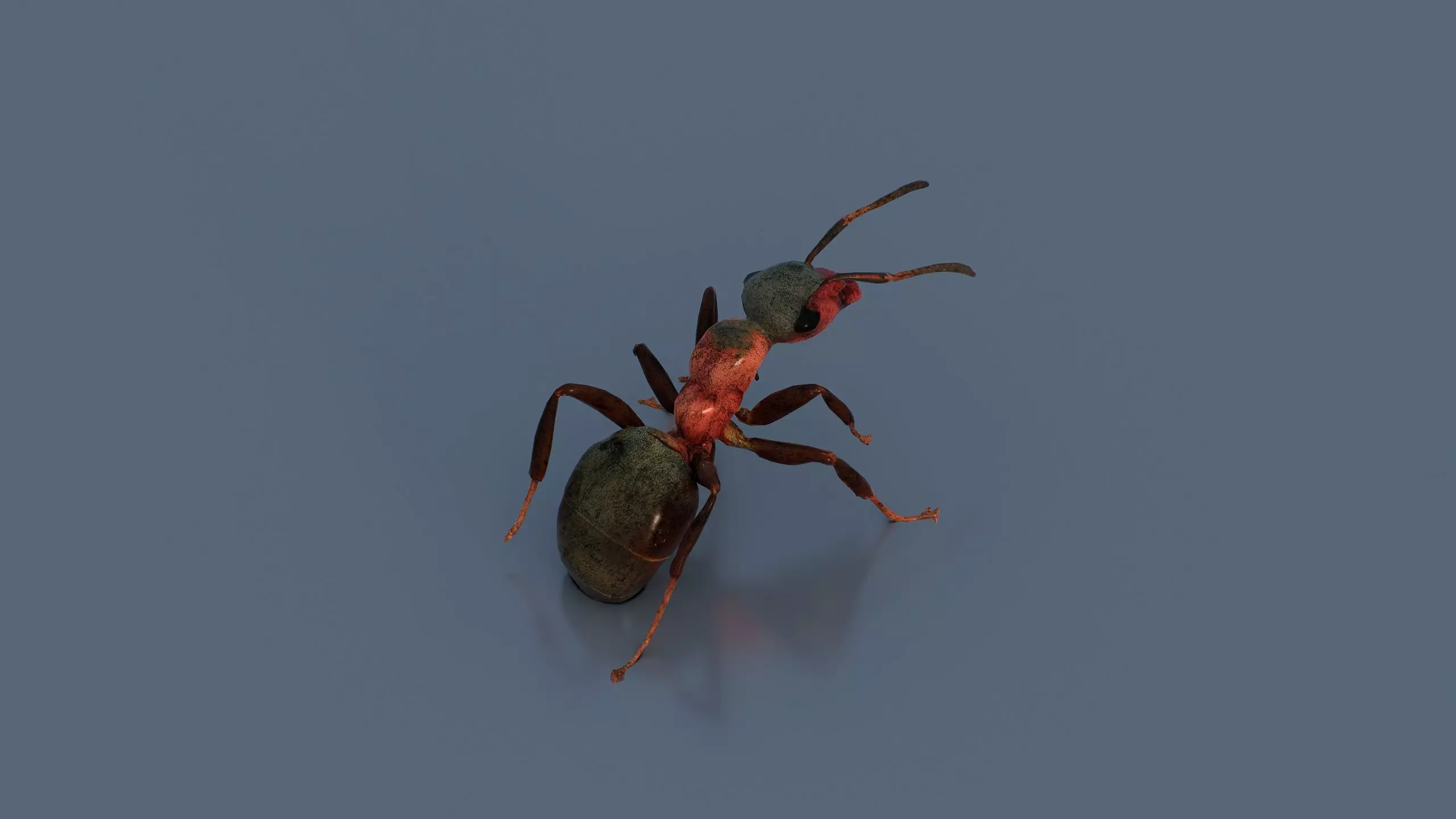 This 3D low-poly ant model is a streamlined design, ideal for games, animations, or educational purposes. With a low polygon count, it ensures efficient real-time rendering. The ant showcases a reddish-orange head with long, thin antennae, a darker thorax, and a large black abdomen. Its six slender legs, tipped with orange, give it a dynamic appearance as it seems to move while carrying a small black object beneath it. Set against a plain gray background with soft lighting, the model casts gentle shadows, enhancing its stylized 3D form.