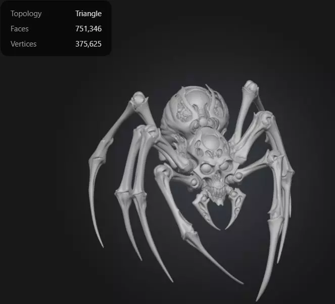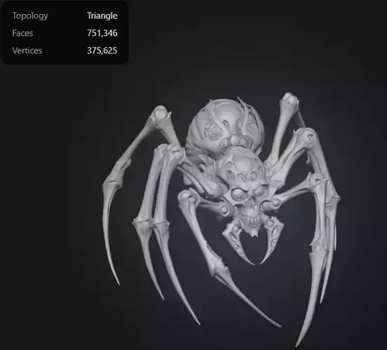 Skull Spider – High-Poly Biomechanical Creature Model (Color + Grayscale Variants)This menacing arachnid-inspired creature blends skeletal motifs with biomechanical armor, sculpted in high detail using Meshy AI’s full suite of tools. With glowing accents, segmented limbs, and skull-integrated anatomy, it’s ideal for horror, sci-fi, or fantasy environments.• Topology: Triangle mesh• Faces: 751,346• Vertices: 375,625• Rigging: Not rigged• UVs: Fully unwrapped and ready for texture customization• Variants Included:• Full-color version with iridescent green/purple highlights and glowing eyes• Grayscale sculpt emphasizing form, anatomy, and ornamental skull detailing• Style: Biomechanical horror with fantasy and alien influences• Use Cases: Perfect for game bosses, cinematic creatures, concept art, or collectible figure prototyping• Format: [Specify file format—e.g., .obj, .fbx, .glb, .stl]• Compatibility: Works with Blender, Maya, Unreal Engine, Unity, and other major platformsThis creature is built to haunt alien worlds, cursed dungeons, or post-apocalyptic wastelands. Whether crawling through shadows or dominating a battlefield, it’s ready to strike.