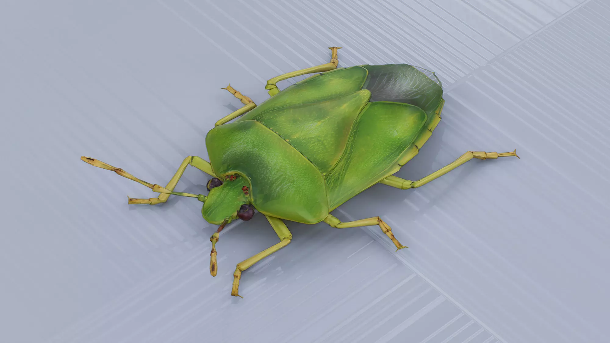 This 3D low-poly model represents a Southern Green Stink Bug (Nezara viridula), a common hemipteran insect. The stylized, reduced-polygon design emphasizes its defining features: a vibrant green, shield-shaped body; six slender legs; prominent antennae; and segmented wings. Ideal for real-time applications like games or simulations, the model balances visual clarity with optimized geometry, capturing the essence of this arthropod's form and coloration.