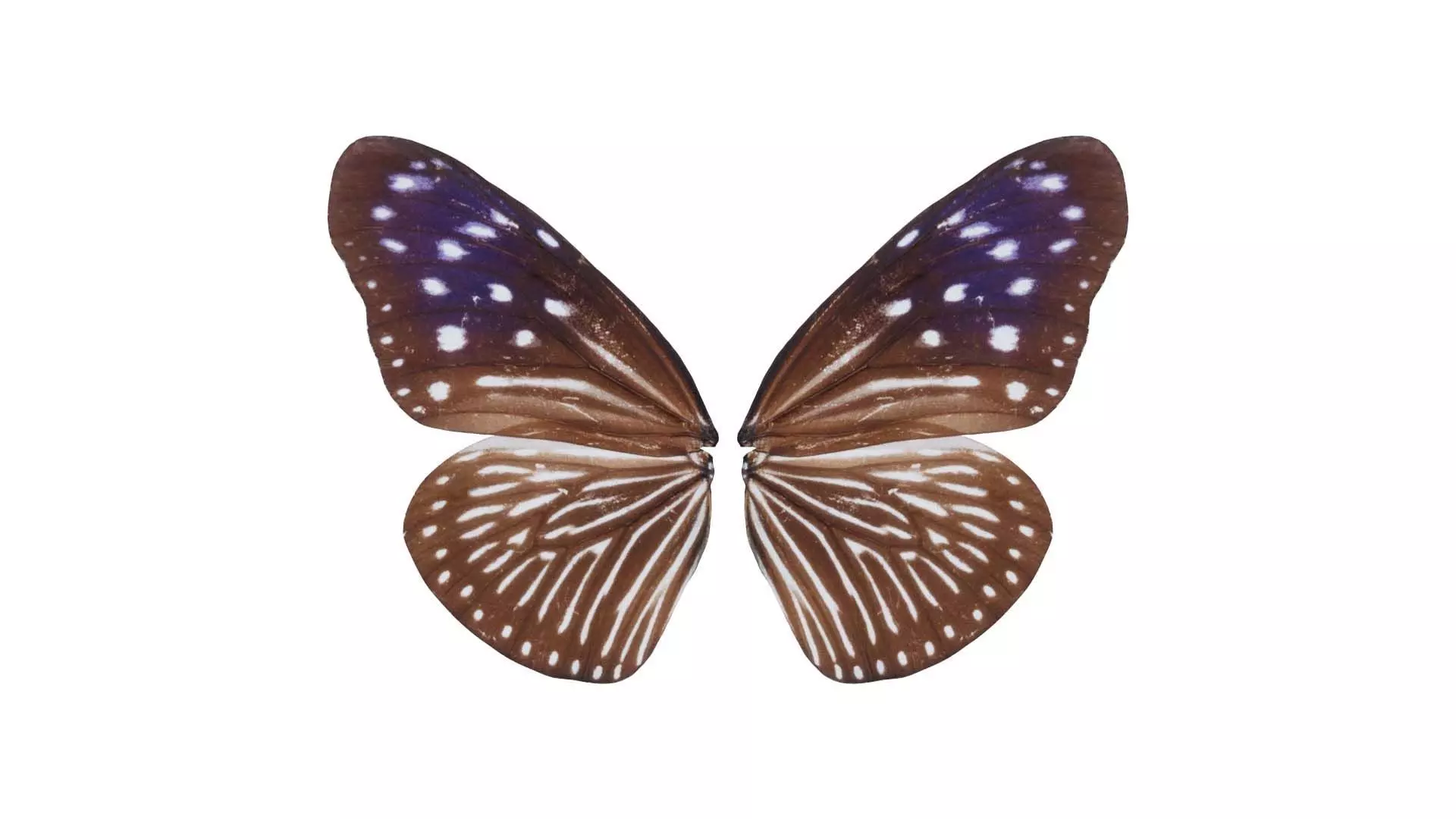 This model, striped blue crow, has been created using photogrammetry from a real world object. It is featuring a butterfly with brown and white spots.The 3D Model is part of the Polygonal Miniatures Remastered collection, which has been optimized with better shaders, correct scaling (meters) and centered position.We use multi camera capturing in the 3D scanning process. The scan data is cleaned and processed in Zbrush and Photoshop. In the end, the low poly product contains unwrapped UV's, textures and normals maps. Detailed specifications can be found below: