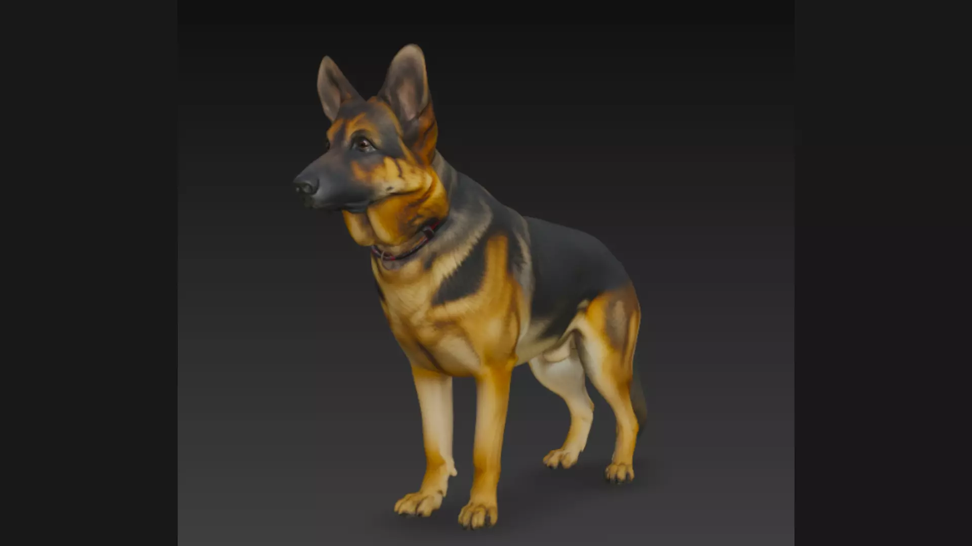 A high-quality 3D model of a German Shepherd dog, ideal for animations, video games, simulations, or architectural visualizations. Includes precise musculature, realistic fur textures, collar detail, and an alert standing pose.