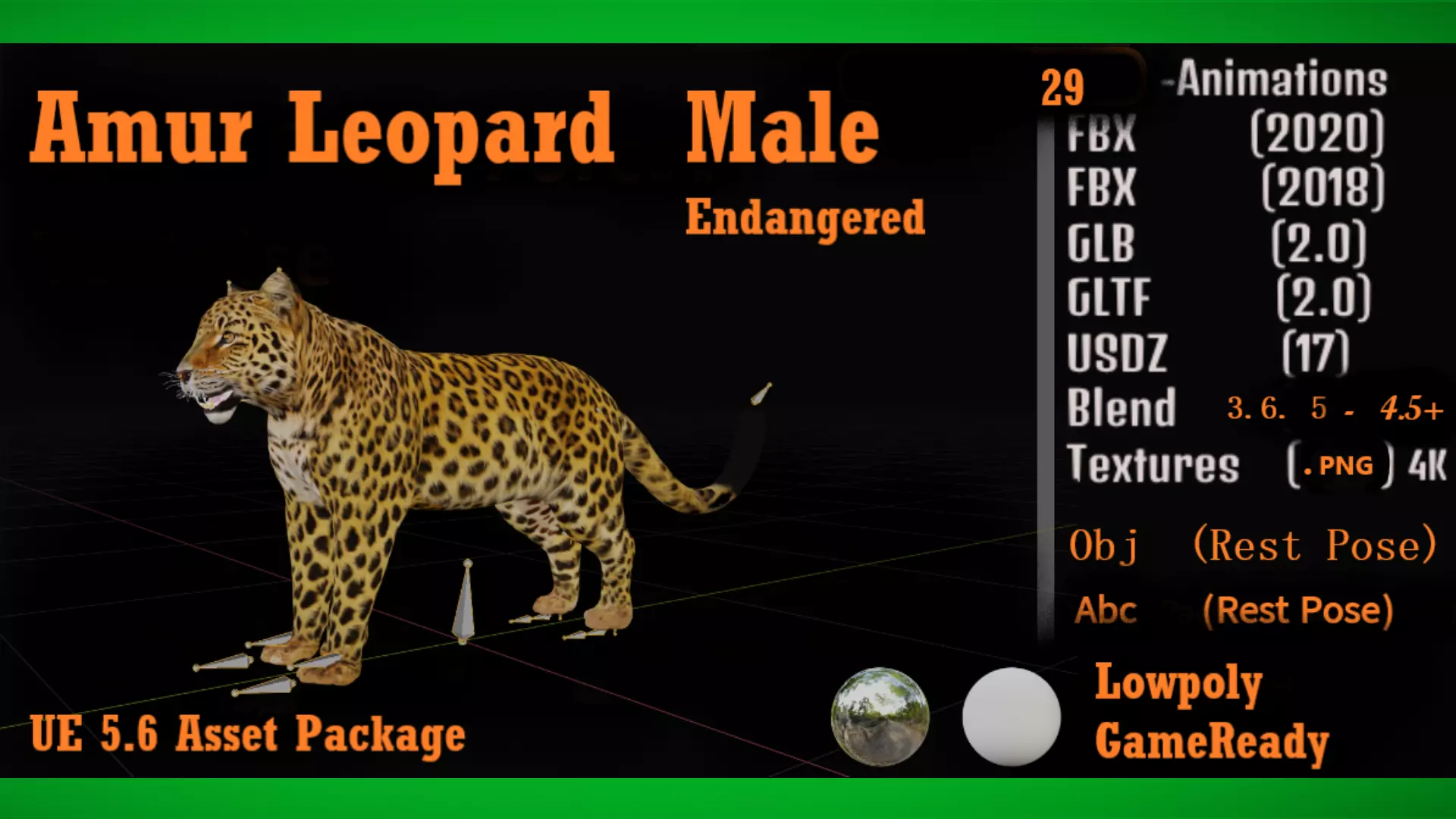 The Amur leopard is a leopard subspecies native to the Primorye region of southeastern Russia and northern China. It is listed as Critically Endangered on the IUCN Red List, as in 2007, only 19–26 wild leopards were estimated to survive in southeastern Russia and northeastern China. .3D Male Amur Leopard Realistic Animal Model By Nyilonelycompany (nyc).Thank you.