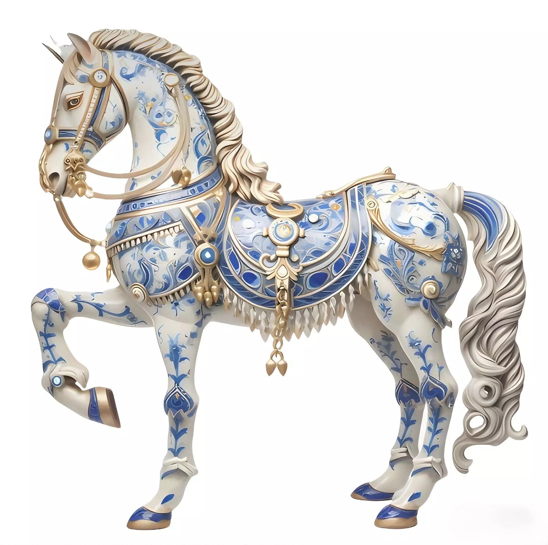 This Blue Gold Ceramic Horse is an exquisitely detailed 3D model of a fantasy ceramic horse, designed for decorative art, virtual staging, or fantasy game environments. Its striking blue and white porcelain-patterned coat is accented with ornate gold barding, a flowing mane, and intricate saddle details, creating a regal, artistic silhouette that blends traditional porcelain aesthetics with fantasy grandeur.The smooth, glossy porcelain textures and delicate gold filigree bring the sculpture to life, making it ideal for collectors, historical projects, or as a statement piece in virtual worlds.