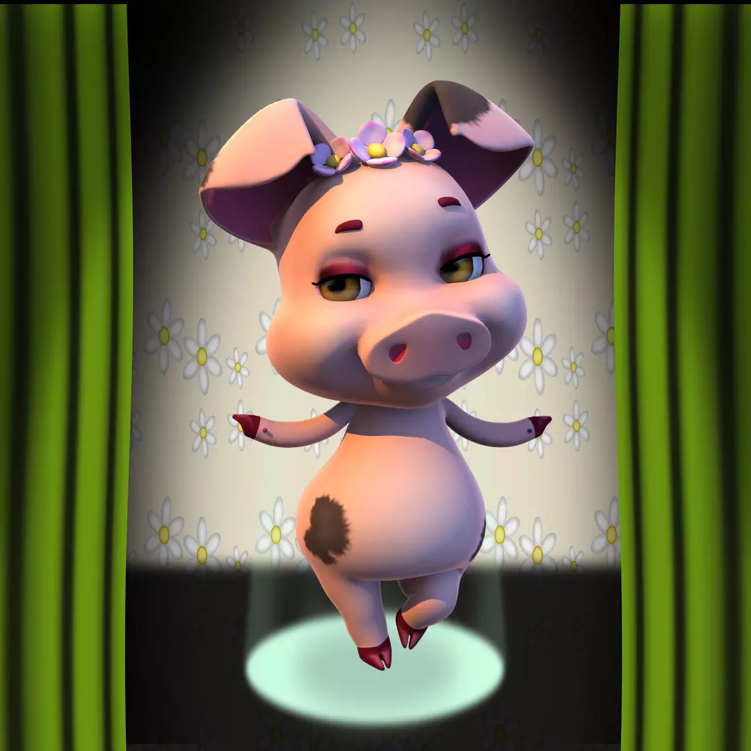 Pretty sow pig with Bouguet on her head. Bouguet Pig Model : SubpatchFacial expression : Morph mixerRig : Basic Foot IKready to animate.