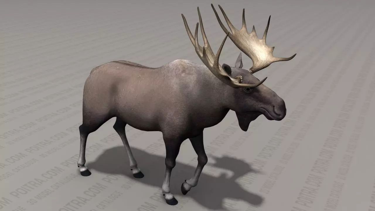 3D Model Moose (Alces alces, meaning Elk), Adult Male Bull Moose with large antlers (Pose 1) by POITRA Visual (Textured 3D Model). Pose 1 is an individual moose model taken from our 3 Pose Moose Collection (sold separately). Our 3D model moose's body, eyes, and antlers are separate 3d objects (see rendered images). Moose are the largest of the deer family (Cervidae). The male moose grow new antlers each year, shedding them every spring.