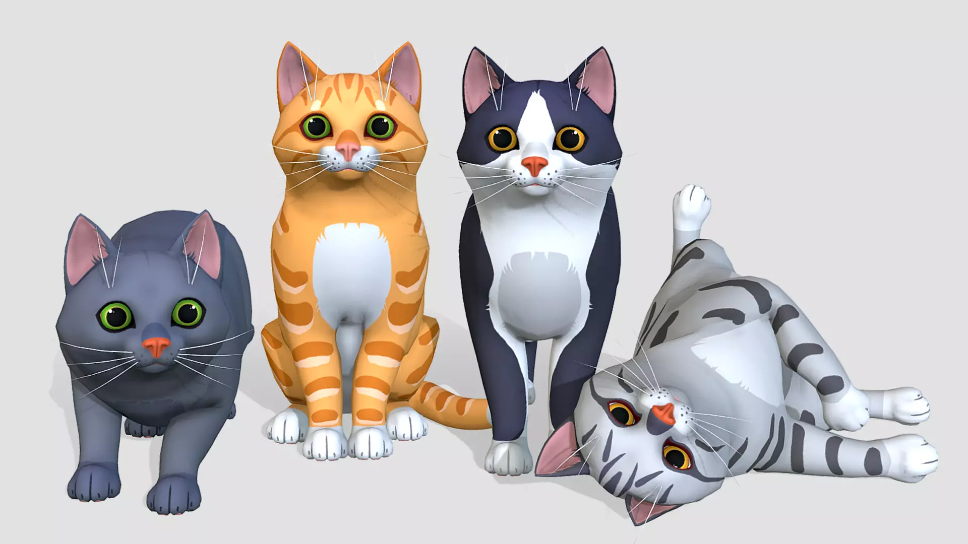 The asset includes cat accessories: food bowls, balls, cat toys, cat tray, cat house, carrier, scratching post, cat beds.
