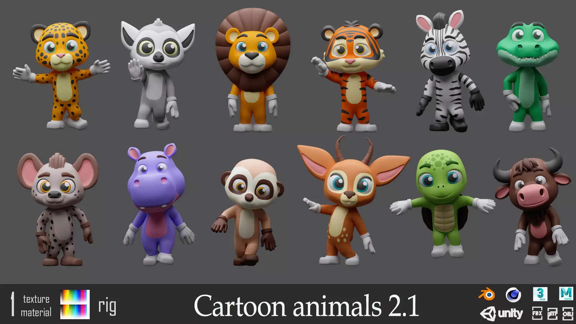 12 cartoon character models african animals in the set:Tiger, lion, zebra, leopard, hyena, lemur, antelope, crocodile, meerkat, turtle, buffalo, hippopotamus.