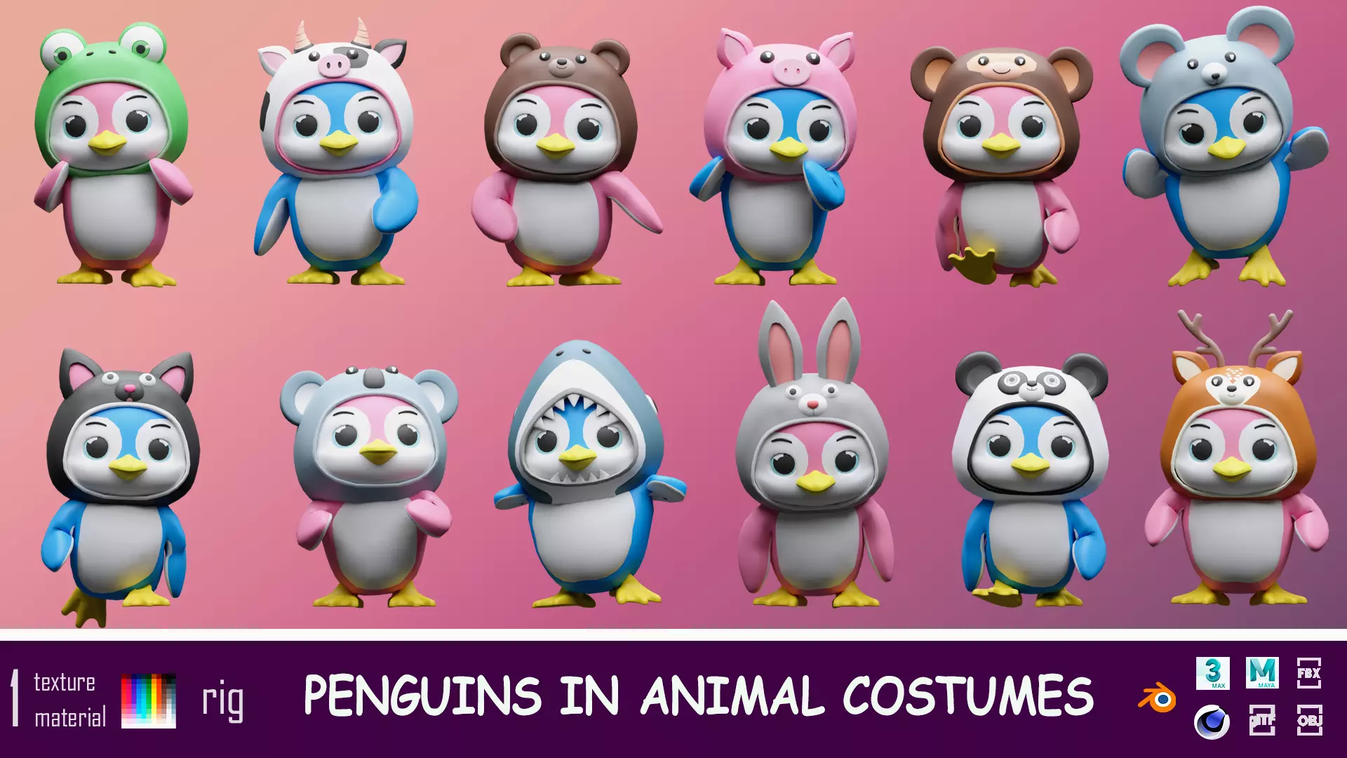 Penguins in costumes mouse, frog, shark, pig, panda, rabbit, monkey, cat, deer, cow, koala, bear.