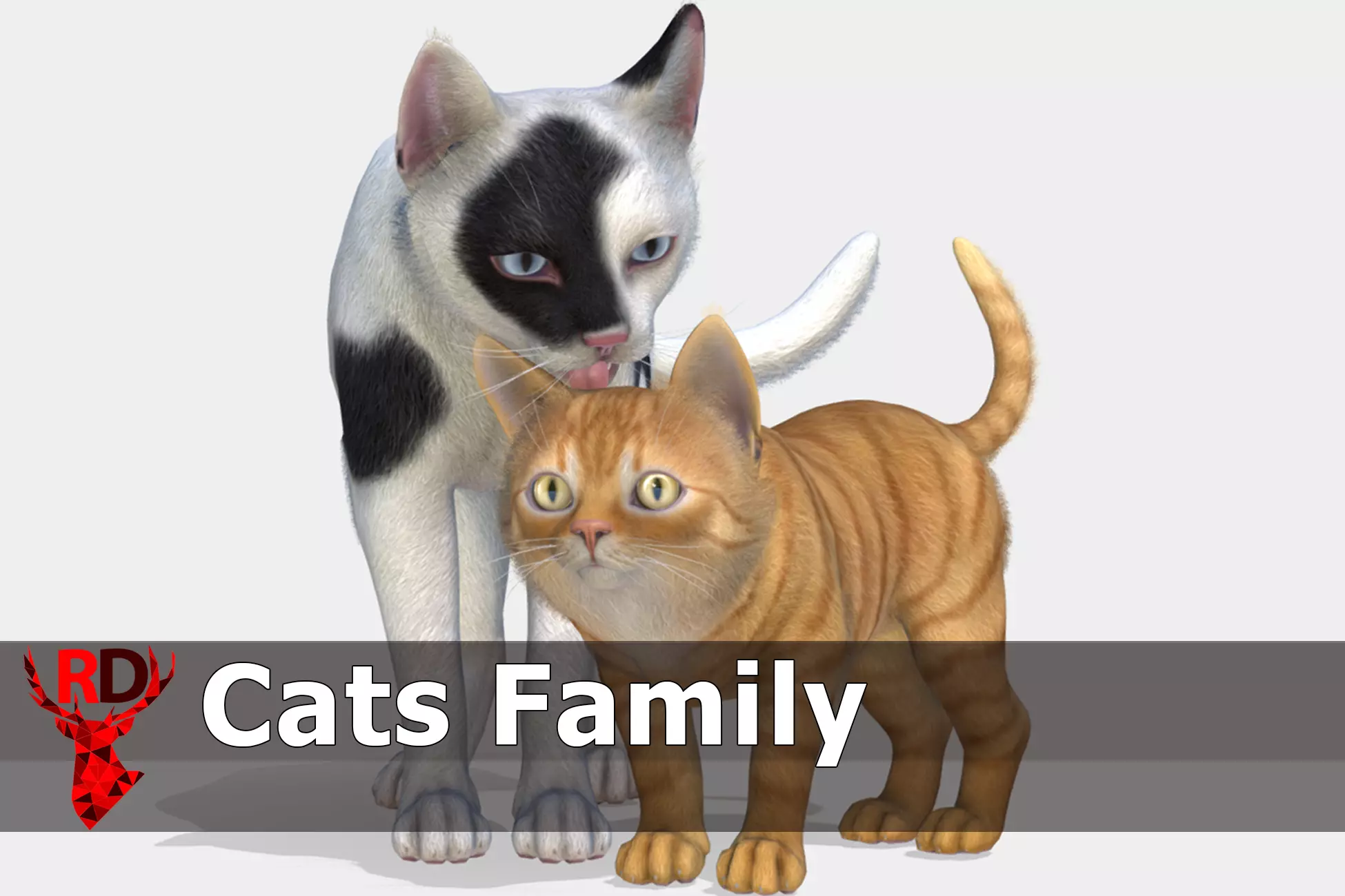 The pack includes 4 variants of cats - a thin cat, a stray cat, an ordinary cat and a fat cat. Each geometry option has 5 types of color.Kitten models have 5 color variations and one geometry.