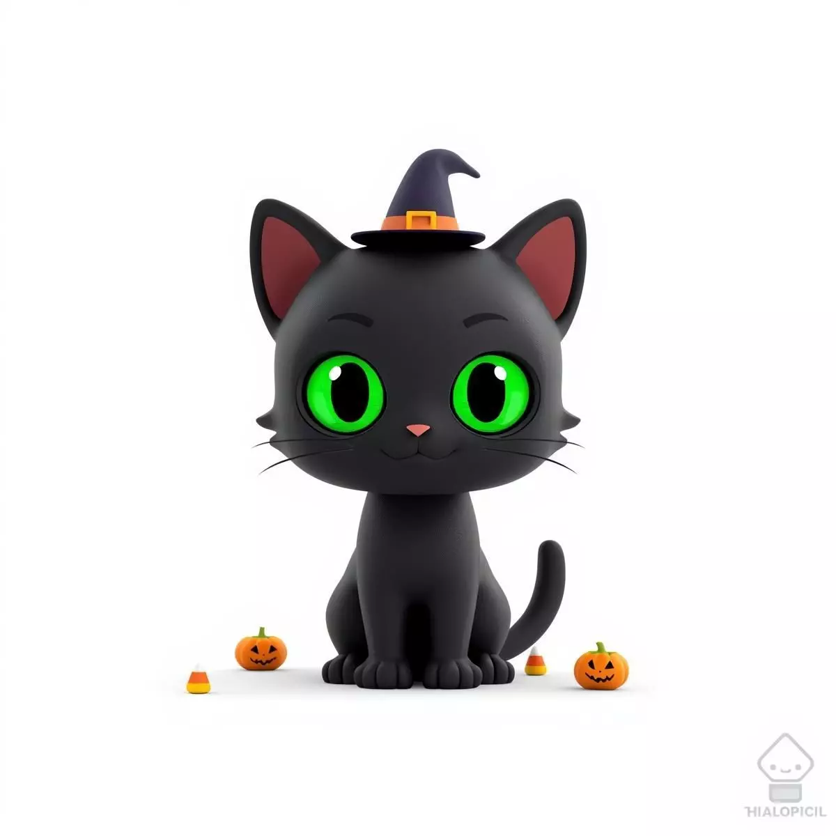 Adorable black cat character in a witch hat.Vibrant green eyes and a friendly, smiling expression.Surrounded by charming Halloween pumpkins and candy corn.Perfect for children's content, holiday decor, and games.Optimized for animations, games, and high-quality renders.Includes OBJ, FBX, and GLB file formats.Clean mesh and high-quality, charming details.Great for kids' brands, holiday projects, and creative displays.20 One-Word Tags: