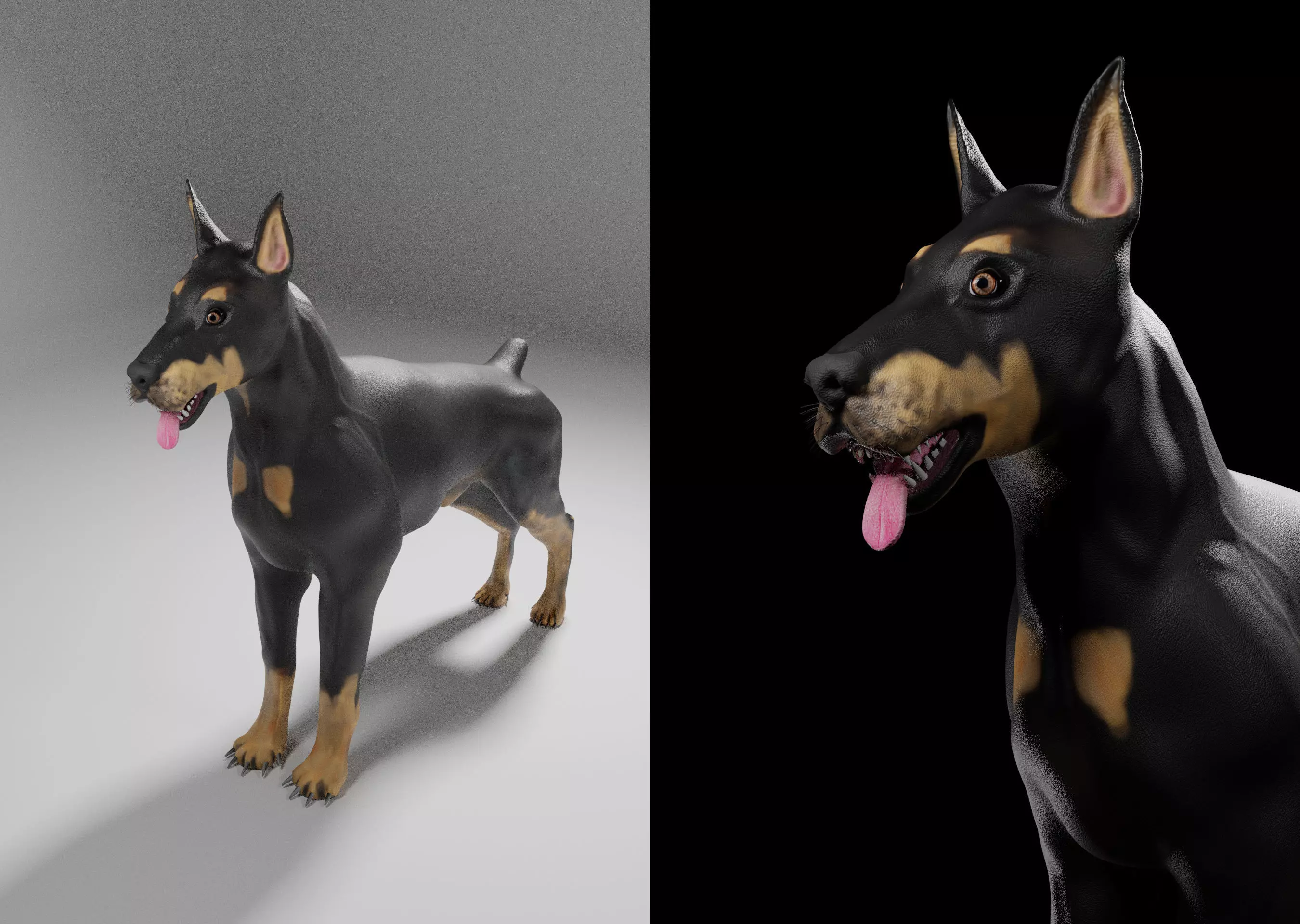 This is a realistic model of Doberman Dog with subdivision ready you can modify it further according to your need. modifiers not applied. FBX and obj file as modifiers applied (it is having more Polycount). lod(level of details) can be adjusted. The body of doberman contain multiresolution modifier with 3 subdivision levels. it contains 17,150 vertices without multiresoution modifier applied in viewport. after applying multiresoution modifiers upto level 3 in viewport it contains 183,524 vertices.the model's body parts are parented to an empty.