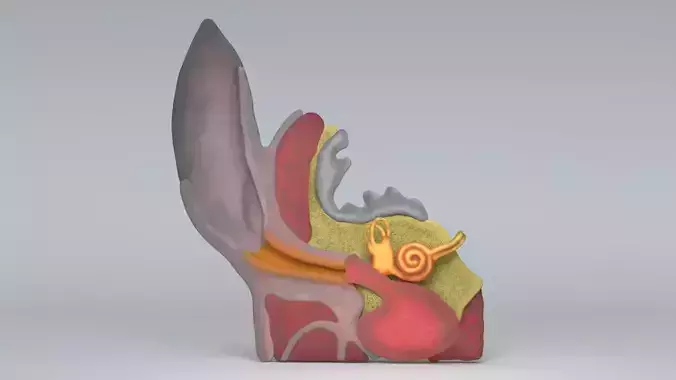 Dog Ear Anatomy - Cross-Section 3D ModelThis is a high-quality, anatomically accurate 3D cross-section of a canine ear. Designed for veterinary students, educators, and medical illustrators, this model provides a clear view of the complex internal structures of a dog's ear canal and middle ear.