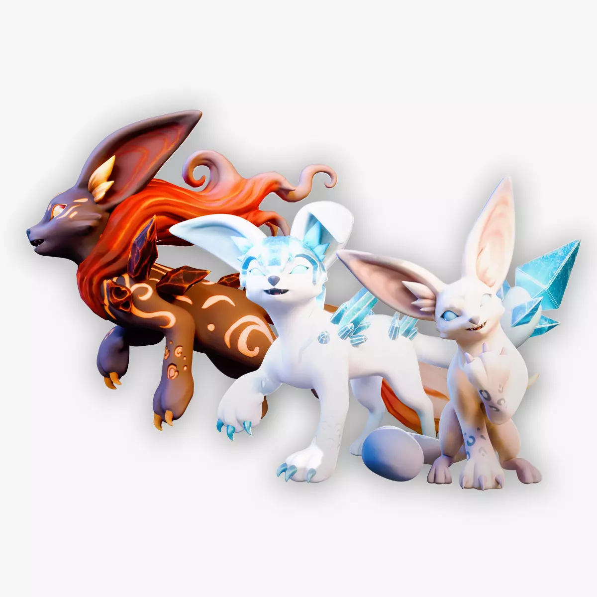 Introducing the complete Elemental Mana Beast Pack. This bundle features the original stylized creature plus two new elemental variations (Fire and Ice), transforming the base design into a versatile monster set for your games or animations.Each variation comes with unique Addon Parts (Mesh-based flames for Fire, Crystal shards for Ice) that visually distinguish their elemental power. All three characters are fully rigged, textured, and Animated.Created natively in Blender 5.0, these models feature clean topology and a charming creature-collecting aesthetic.