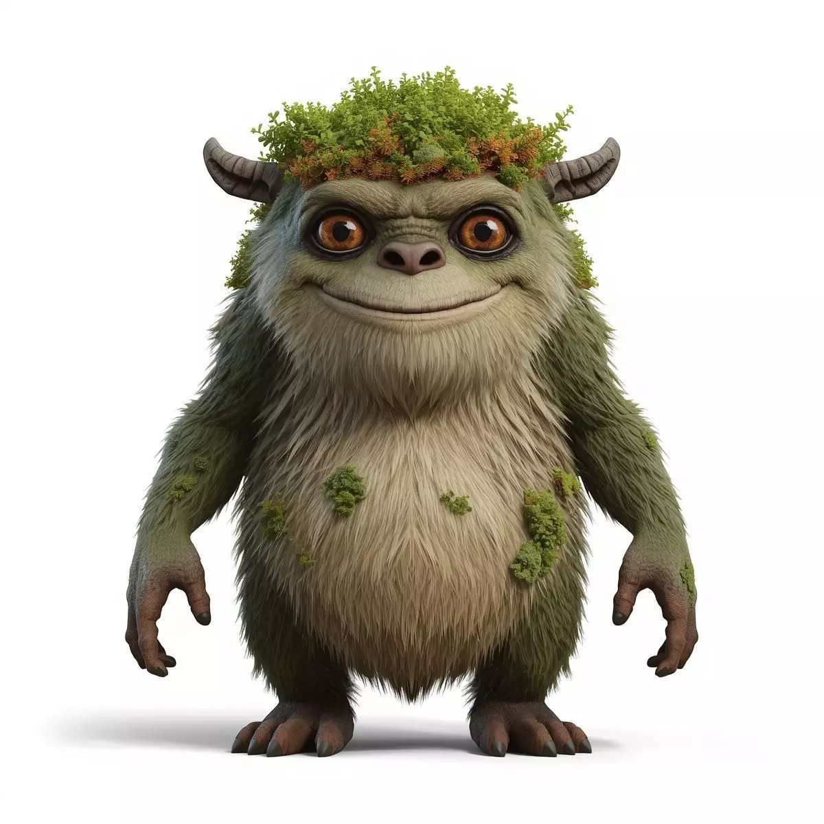 Tagsforest monster, 3D character model, friendly creature, game-ready asset, rigged character, PBR fur textures, moss-covered, stylized monster, VR/AR optimized, semi-realistic