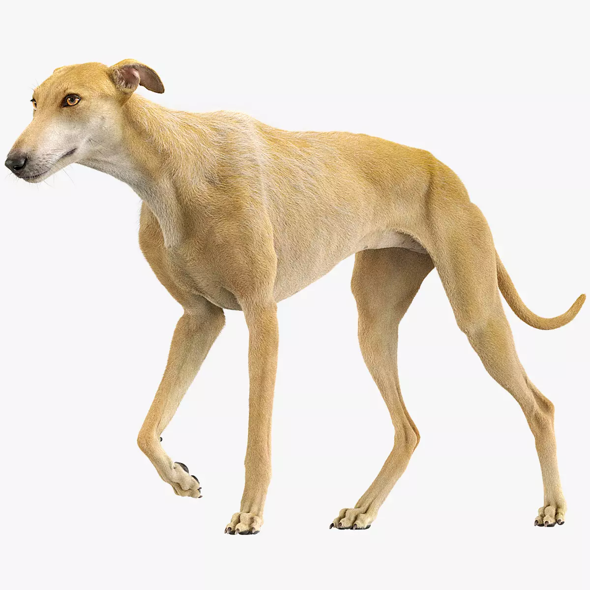 Realistic Spanish Greyhound model. UVmapped, textured, fully RIGGED and ANIMATED.Smoothable mesh with quads mostly.Mouth is openable and have all inside stuff.Claws, eyes, gum, teeth and tongue are separated meshes.