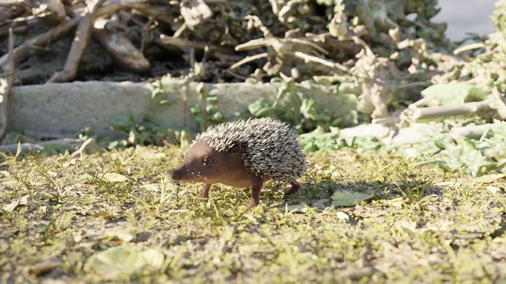 Hi! The pack cointains the original blend. file with the rigged, textured and animated model of the hedgehog. The terrain is also textured. The scene contains lights. There are also fbx, obj, and dae files inside. The models are mid poly. There are textures for the plants and ground. There are scanned elements that fits the scene.