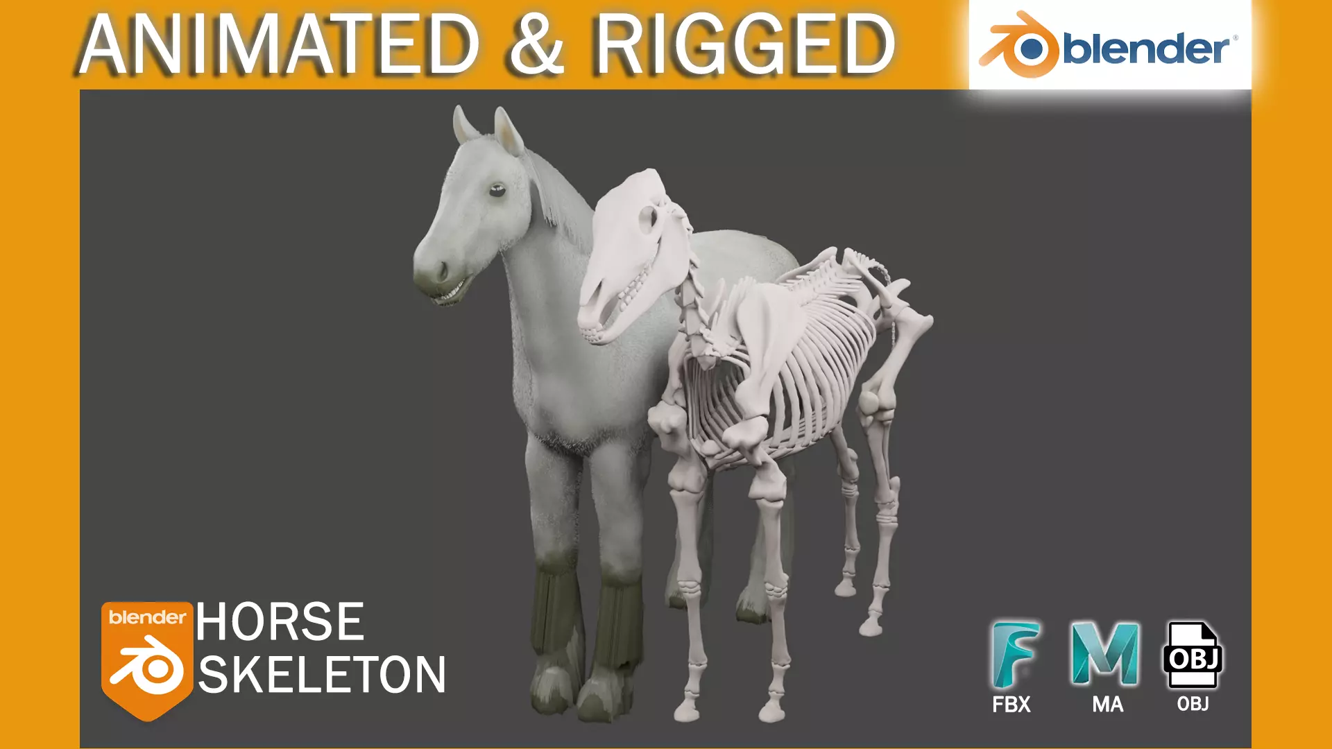 Horse and Anatomy model- This is a Percheron horse model with horse Anatomy of Highly Detailed Realistic Horse model.Clean UVmapped, professional textured, rigged and animated. Based on high quality sculpting.This model contains both horse model with its Skeleton.This model can be used for x-musle system.The horse and skeleton are rigged with animations include, running,walking,etc.The horse model is haired in blender2.93.This model can be used for movies,VFX,etc.FORMATS included: Blender(2.93), .obj (wavefront), .FBX (Autodesk), Maya