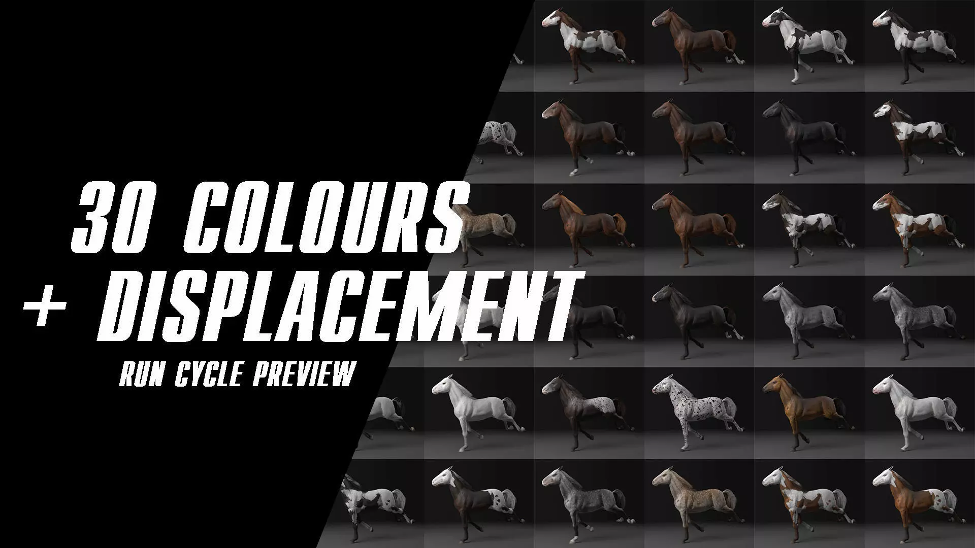 Rigged horse model with UV and 34 colour versions. Created in Maya, sculpt made in Zbrush, exported as displacement map. Catclarck type of subdivisions lets a better result for displacement render.