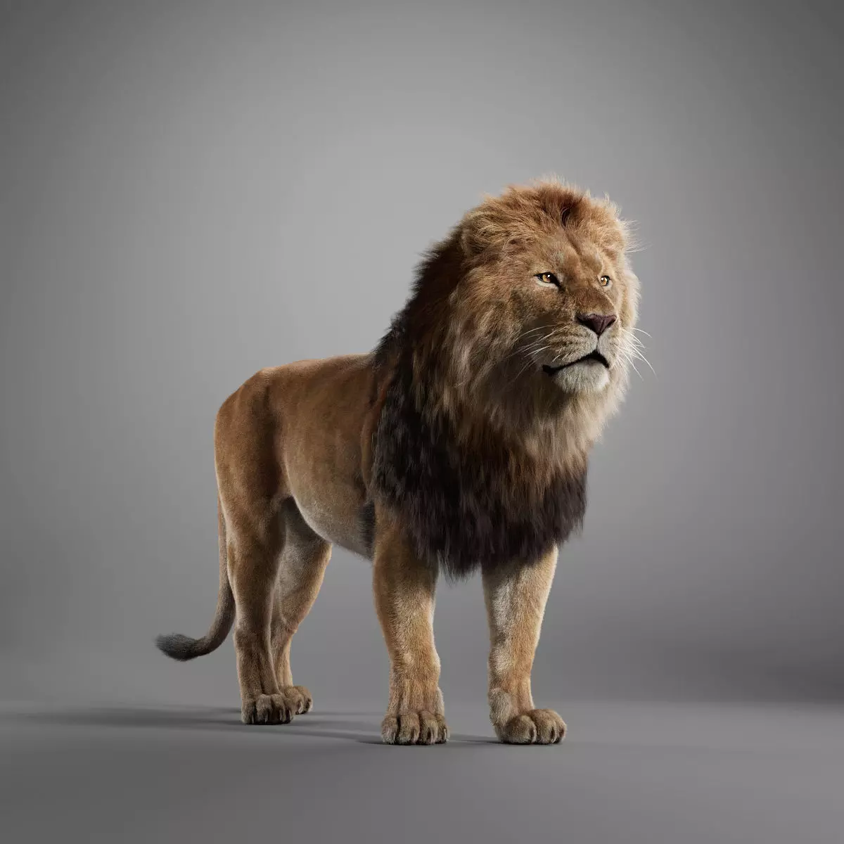 This is a high-quality male lion model with maps, fur and rigging. The fur is created in XGen interactive with enough details, and all textures are rendered with Arnold renderer for realistic effects. The rigging is created with reference to real bones, making the animation in line with natural movements. The model is created with Maya 2024 at real-world scale.