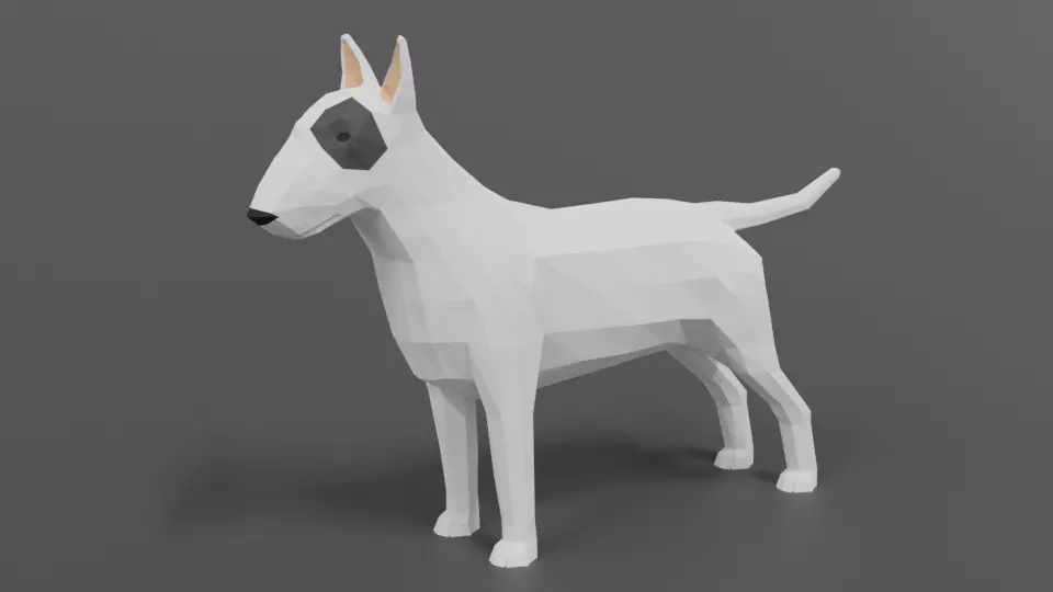 This is a low poly 3D model of a Bull Terrier The low poly terrier was modeled and prepared for low-poly style renderings, background, general CG visualization presented as a mesh with quads only.