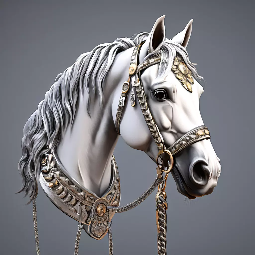 This highly detailed 3D model showcases a majestic white horse bust adorned with an ornate gold and silver bridle. Ideal for game development, film, architectural visualization, and digital art projects, the model captures the elegance and grace of the animal. It's suitable for both real-time and static rendering applications. Available formats include GLB, OBJ, STL, FBX, and DAE, ensuring compatibility with various software. The model is UV unwrapped and features PBR textures, enhancing realism and simplifying integration into your workflow. Its topology is clean and optimized, striking a balance between detail and performance. The horse's expressive features, combined with the intricate details of the bridle, make this model a stunning addition to any project. Whether you are creating a historical scene, a fantasy game, or a striking piece of digital art, this white horse bust will bring a touch of nobility and beauty.