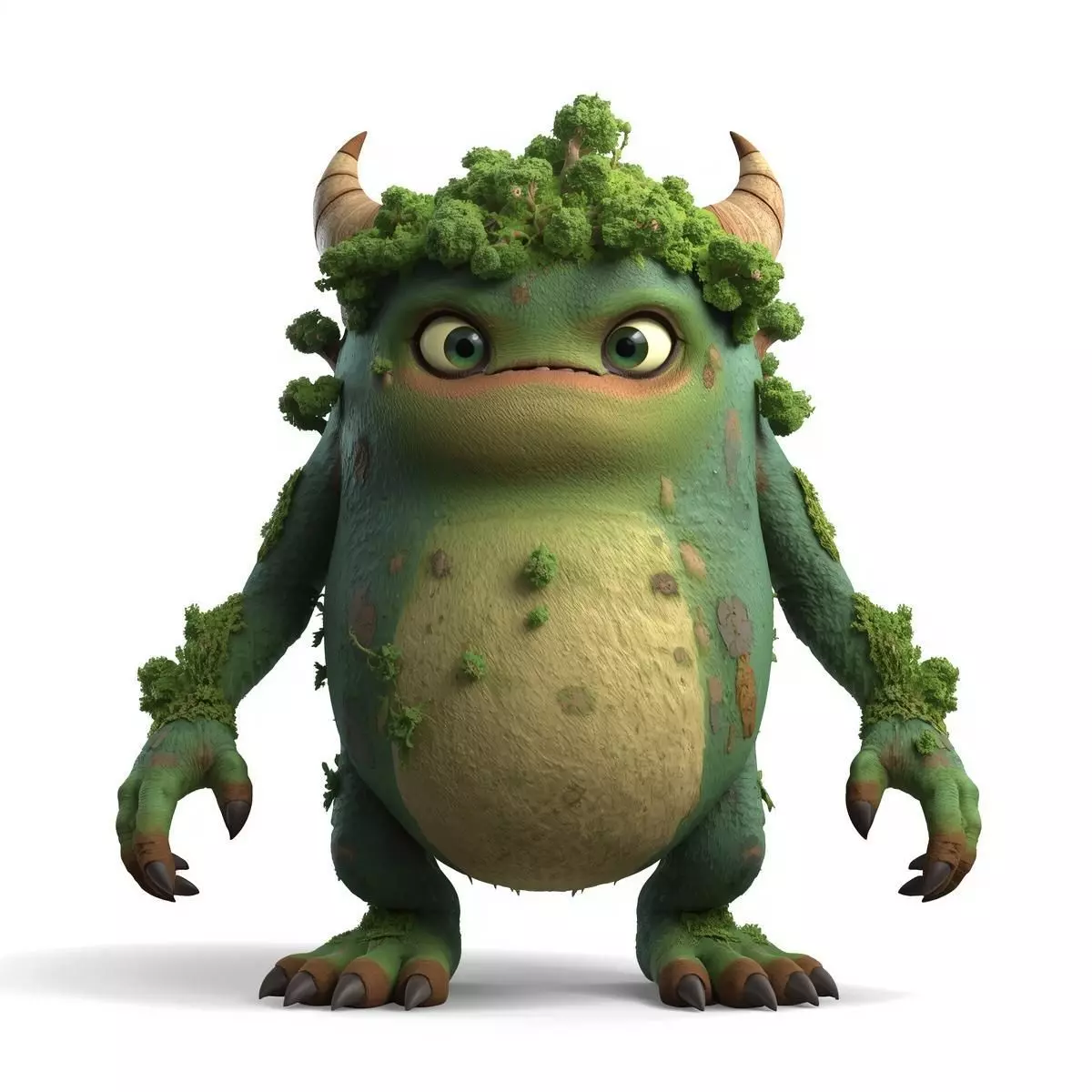 Visual Details: It is characterized by a vibrant green, rounded body with moss-like patches and small trees growing from its head and shoulders. It features large, expressive green eyes, a tan-colored underbelly, and small curved horns with a wood-like texture.