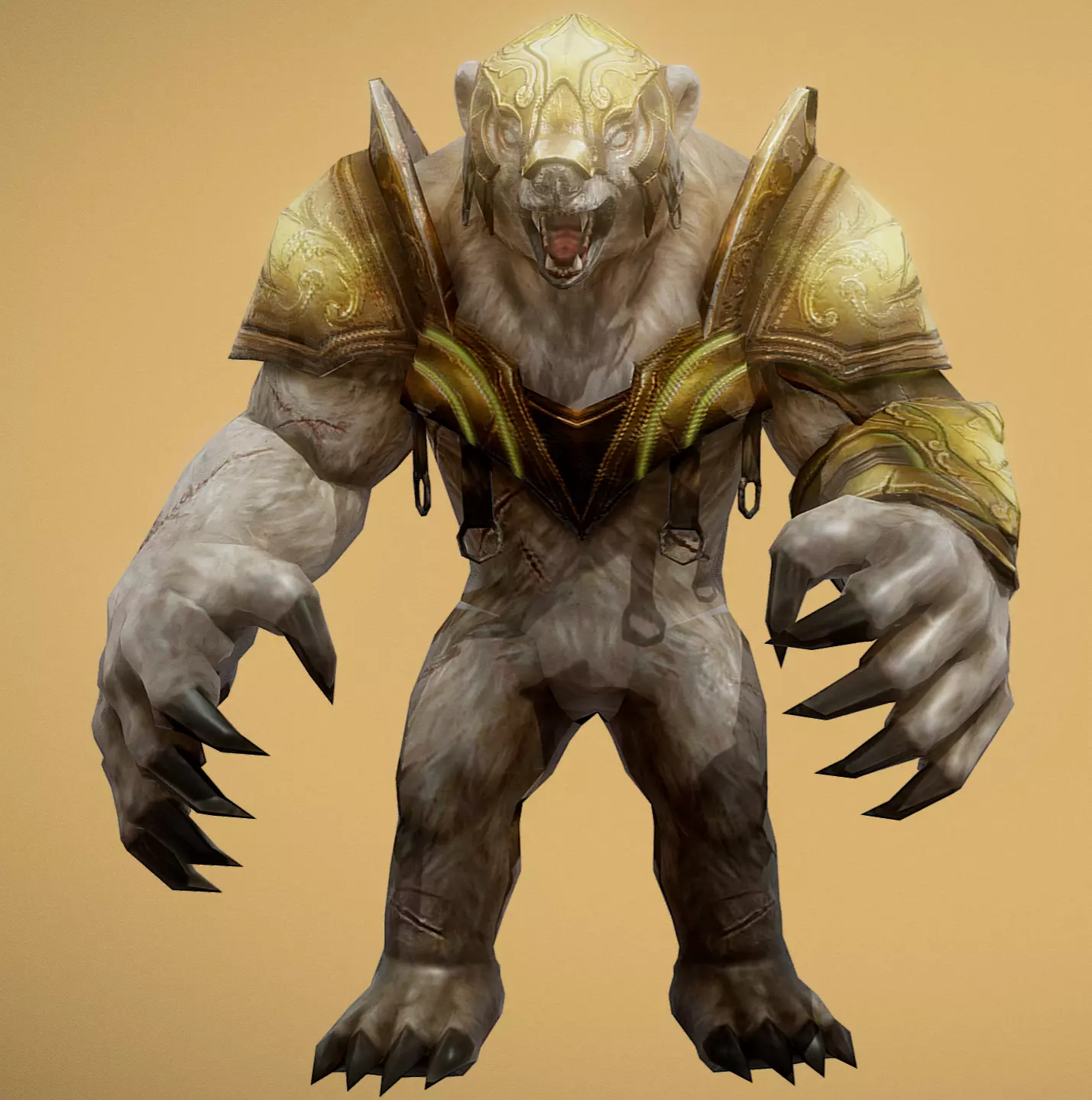 Lowpoly model of polar beast Clad in rugged, battle-worn armor that reflects the harsh environment it calls home, this bear exudes a ferocity matched only by its immense strength. Its sharp claws and teeth gleam menacingly. The model use the same texture and material, Blender, Substance Painter