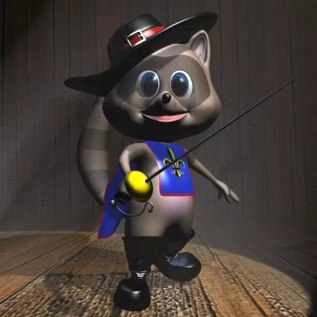 Low poly of a stylized cartoon racoon musketeer made with 3D Studio Max v8.