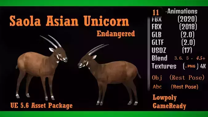 The saola, also called spindlehorn, Asian unicorn, or infrequently, Vu Quang bovid, is a forest-dwelling bovid native to the Annamite Range in Vietnam and Laos. . .3D Saola Asian Unicorn Realistic Animal Model By Nyilonelycompany (nyc).Thank you.