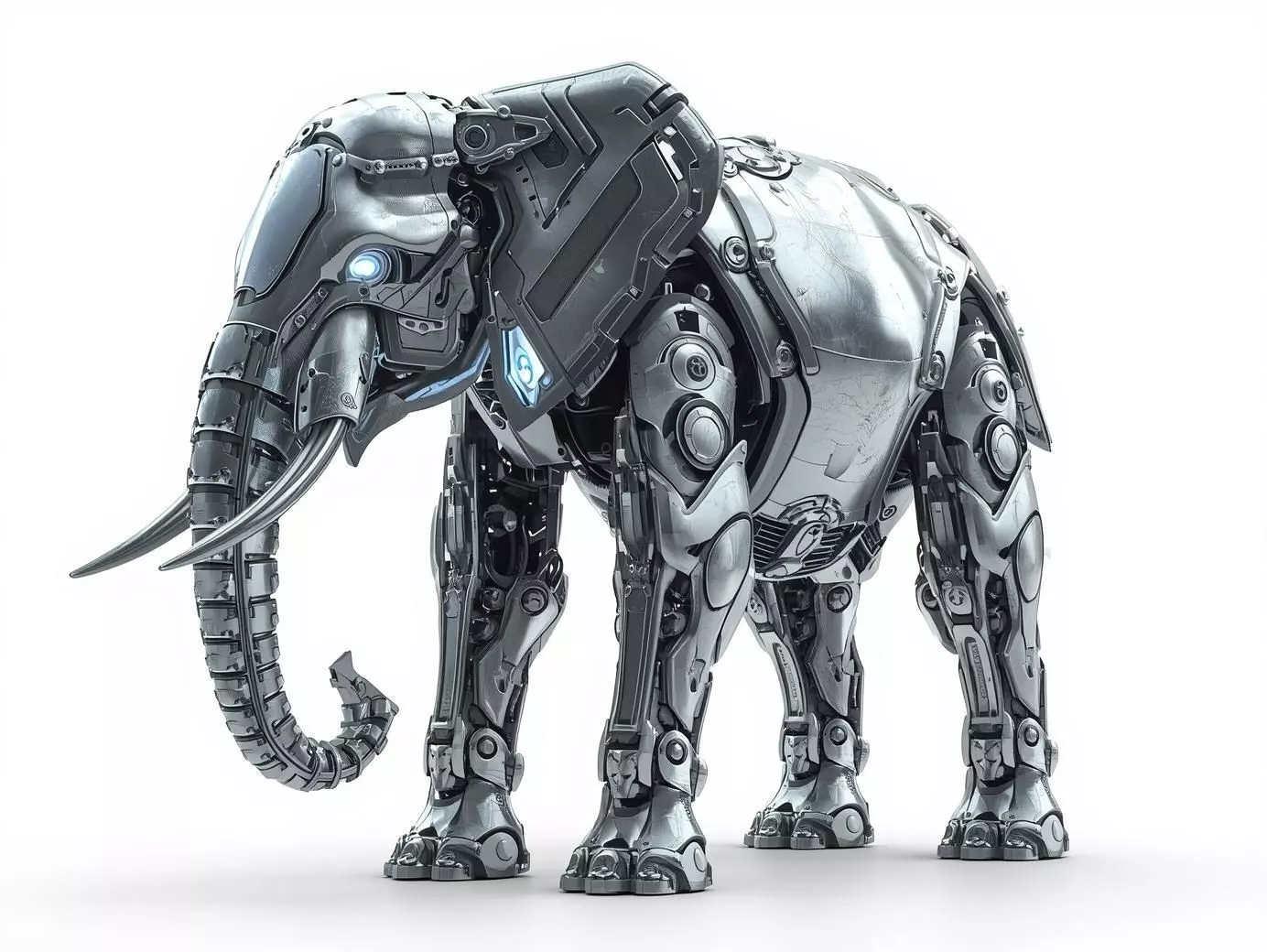 The robot's exterior is covered in smooth, highly polished silver titanium alloy armor, giving it a clean, majestic, and advanced look. This material choice symbolizes wisdom and resilience. The seams of the armor plating and internal joints are accented by thin lines of glowing soft-blue circuitry, suggesting internal power flow and advanced sensors. Key features include highly detailed, articulated piston legs, a flexible mechanical trunk, and massive, curved tusks. The model captures the elephant's size, fully realized as a powerful, elegant automaton.