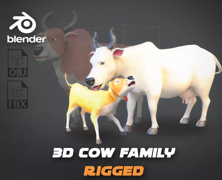 Introducing the Cartoon Cow Family Pack, a stylized trio of fully rigged bovine characters—Cow, Bull, and Calf—designed for animations, games, educational content, and storytelling. Built with clean quad-based topology and optimized for expressive animation, each model shares a unified Rigify metarig and interchangeable texture sets for seamless asset customization.All three variants feature corrected weight painting, mirrored UVs, and stylized proportions tailored for friendly, approachable character design. The Bull includes distinct anatomical features such as horns and a bulkier frame, while the Calf is scaled down with youthful proportions. Despite mesh differences, all models share the same UV layout and rig structure, allowing for shared animations and texture swapping across the family.