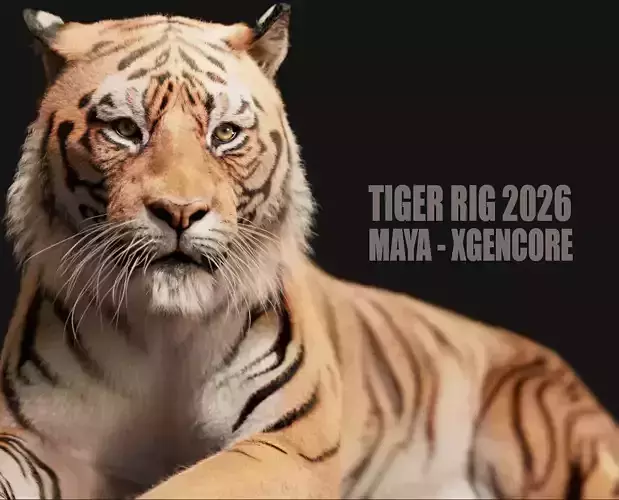 High Detailed Photorealistic Tiger (Maya 2026 version) , fully Rigged – completely UVmapped and textured, made with Maya. Xgen (CORE) for grooming.This model has a clean geometry based on loops and ‘only’ quads.(Ready to render exactly as you see above)