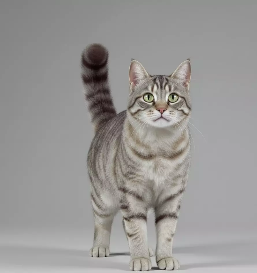 The cat, likely a domestic shorthair, exhibits a classic silver or grey tabby pattern, with distinct dark stripes adorning its flanks, legs, and the signature 'M' marking on its forehead. Its fur appears soft and well-groomed, suggesting health and vitality. The tail is held high and curled, showcasing prominent dark rings that complement its overall striped appearance.The most striking features are the cat's large, luminous green eyes, which are bright and engaging, drawing the viewer into its gaze. Its small, pink nose and delicate whiskers add to its charming expression, conveying a sense of alertness and gentle curiosity. The cat's posture is poised and elegant, with all four paws firmly planted, suggesting a moment of quiet observation. The lighting is soft and even, meticulously highlighting the contours of its face and body, and bringing out the subtle variations in its fur's coloration. This image beautifully captures the unique appeal and graceful demeanor of a beloved feline companion.