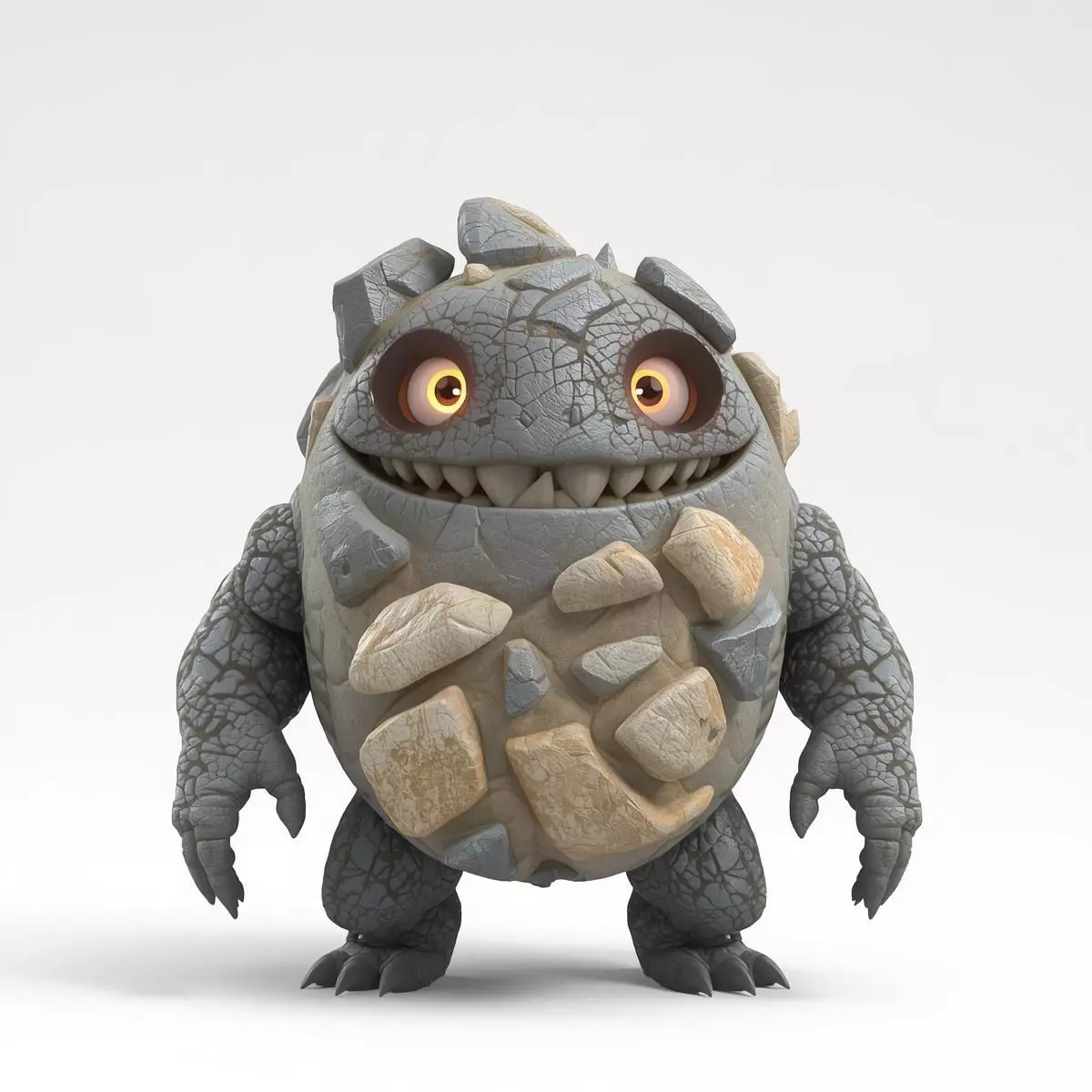 Anatomy: It features a stout, oval-shaped torso composed of integrated rock slabs, with powerful limbs ending in thick, three-fingered stone claws.