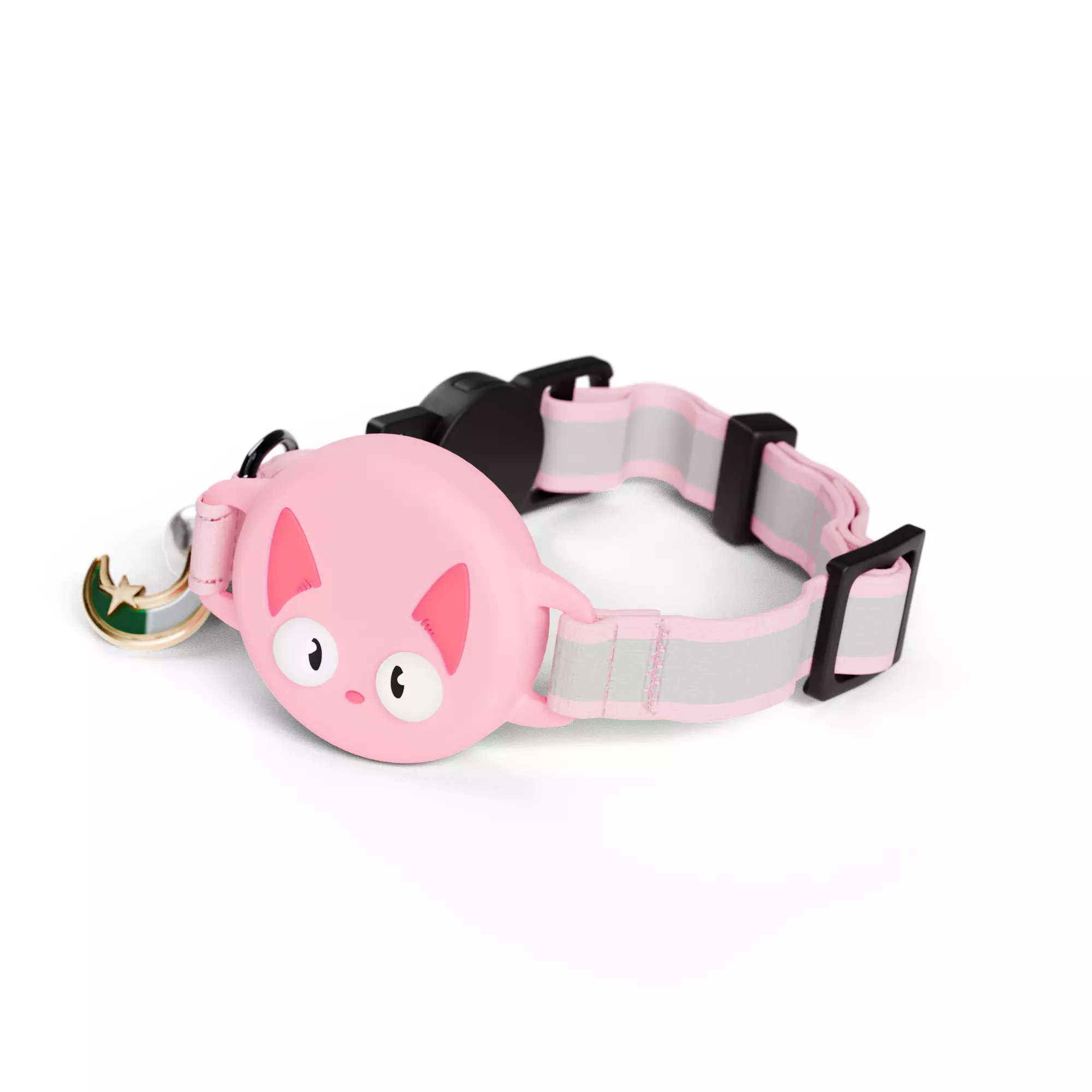 This 3D model features a stylish and playful cat collar in the color Flor de Cerezo, designed with a strap, reflective grey accents for safety, and an adorable round tag showcasing a cartoon cat face. The collar features a secure black buckle, an adjustable strap, and a decorative charm shaped like a crescent with a star for added detail.